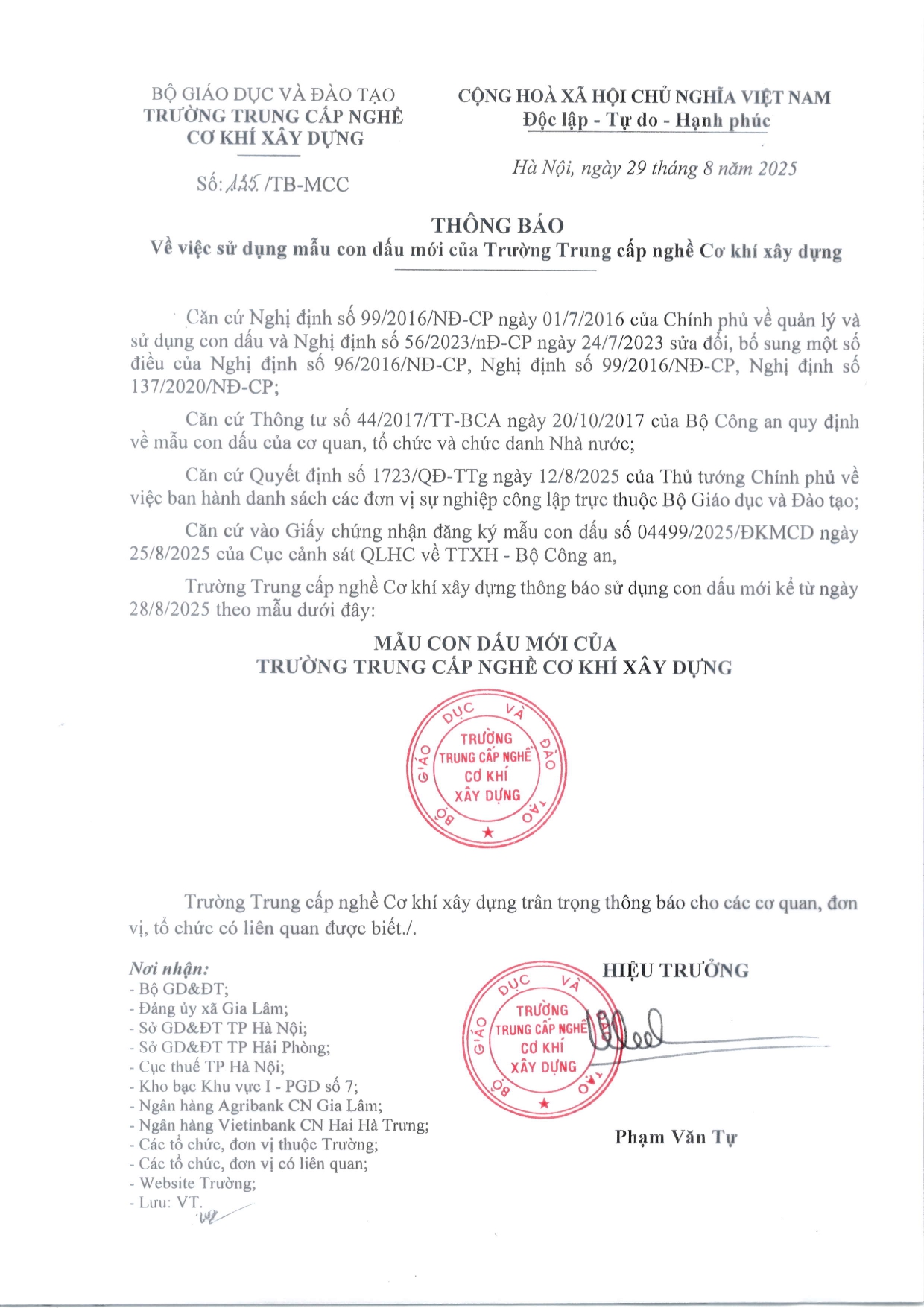 Thông báo về việc sử dụng mẫu con dấu mới